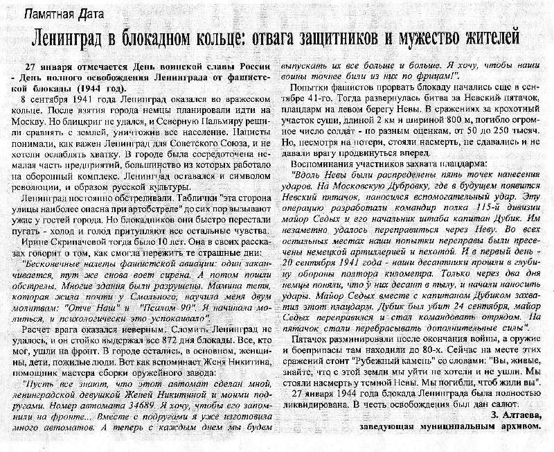 25.01.2019 Газета «Возрождение»: «Ленинград в блокадном кольце: отвага защитников и мужество жителей»