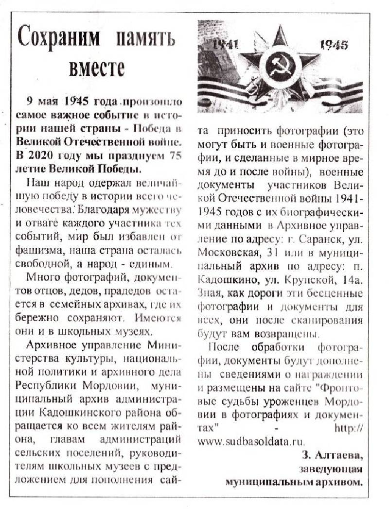 21.02.2020 Газета «Возрождение»: «Сохраним память вместе»