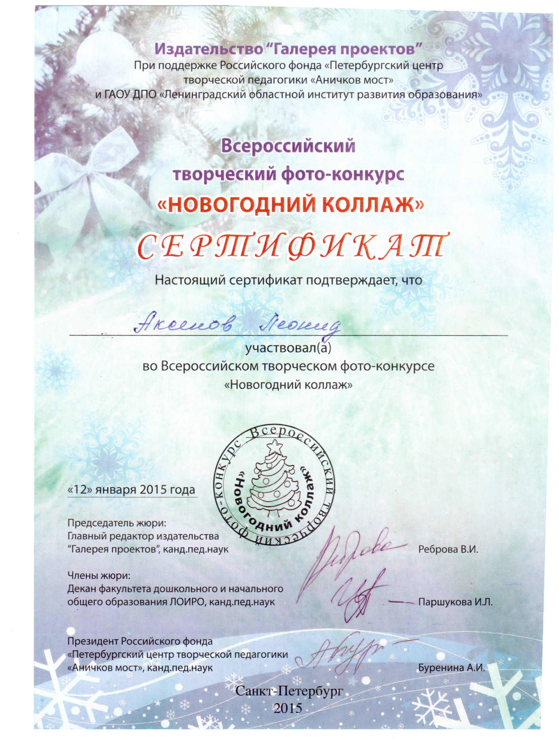 11. Сертификат за участие в конкурсе Аксенов Леонид 6 лет