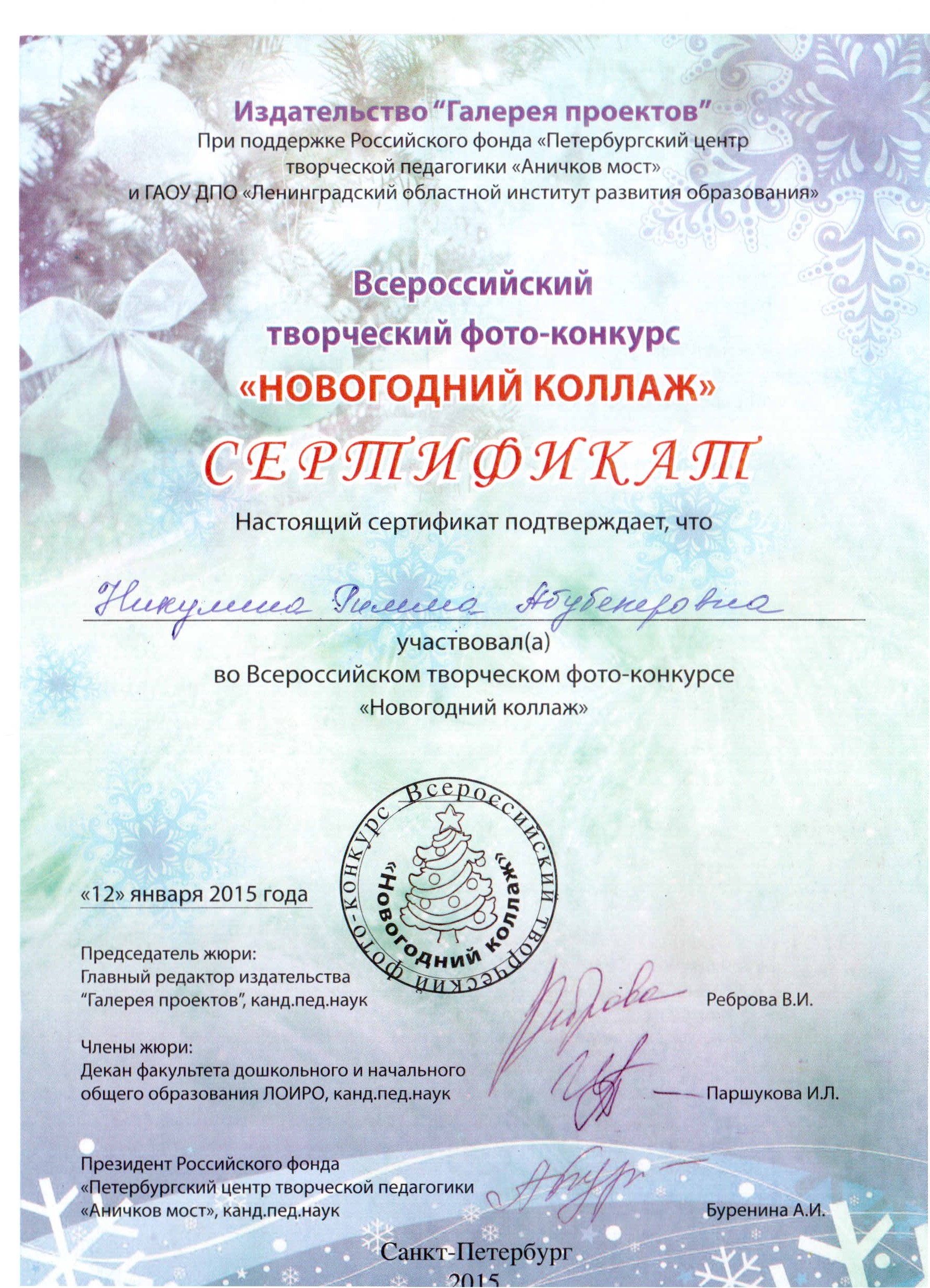 13. Сертификат за участие в конкурсе Никулина Римма Абубекеровна, воспитатель группы раннего возраста (коллективная работа)