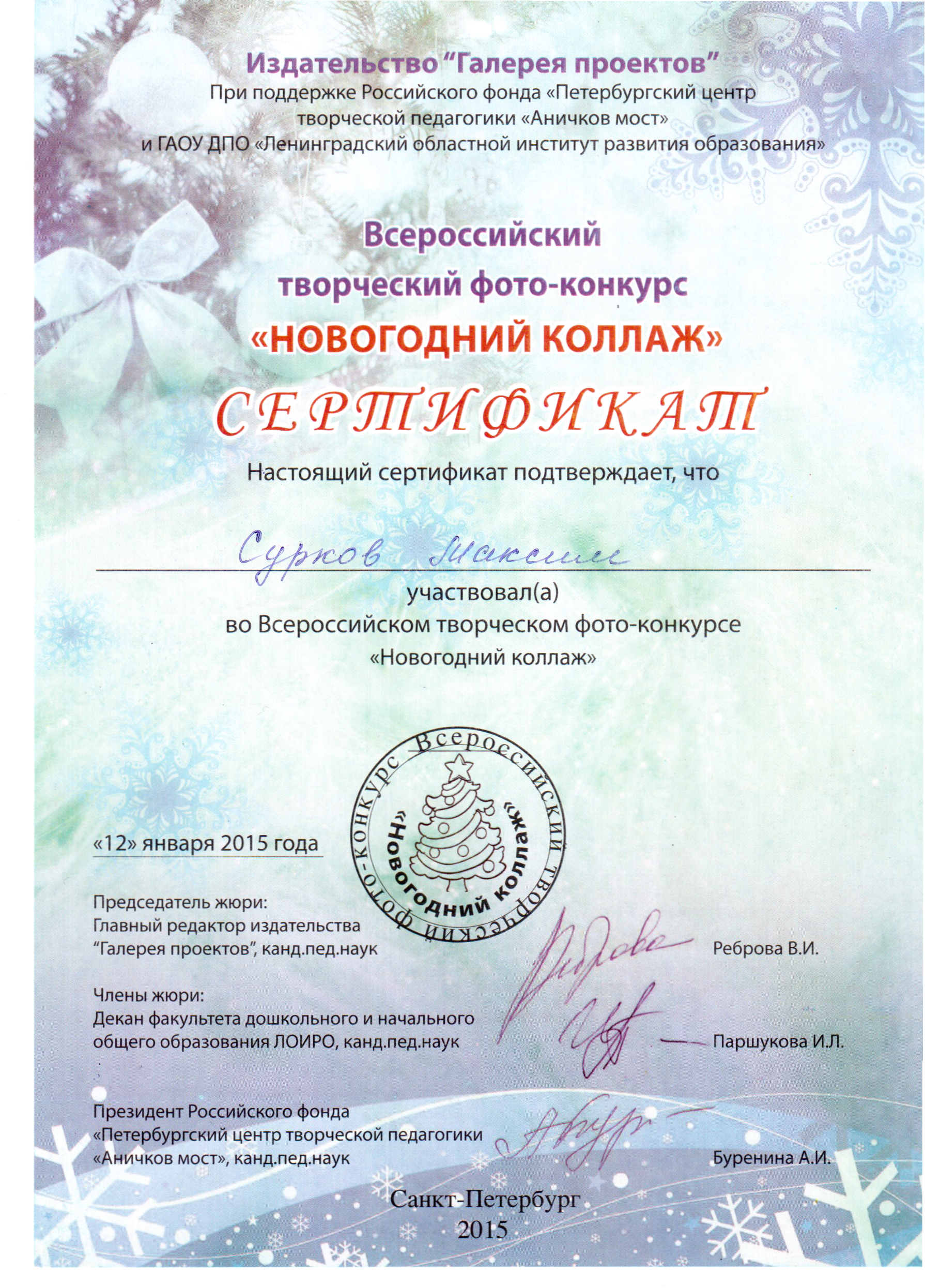 12. Сертификат за участие в конкурсе Сурков Максим 6 лет