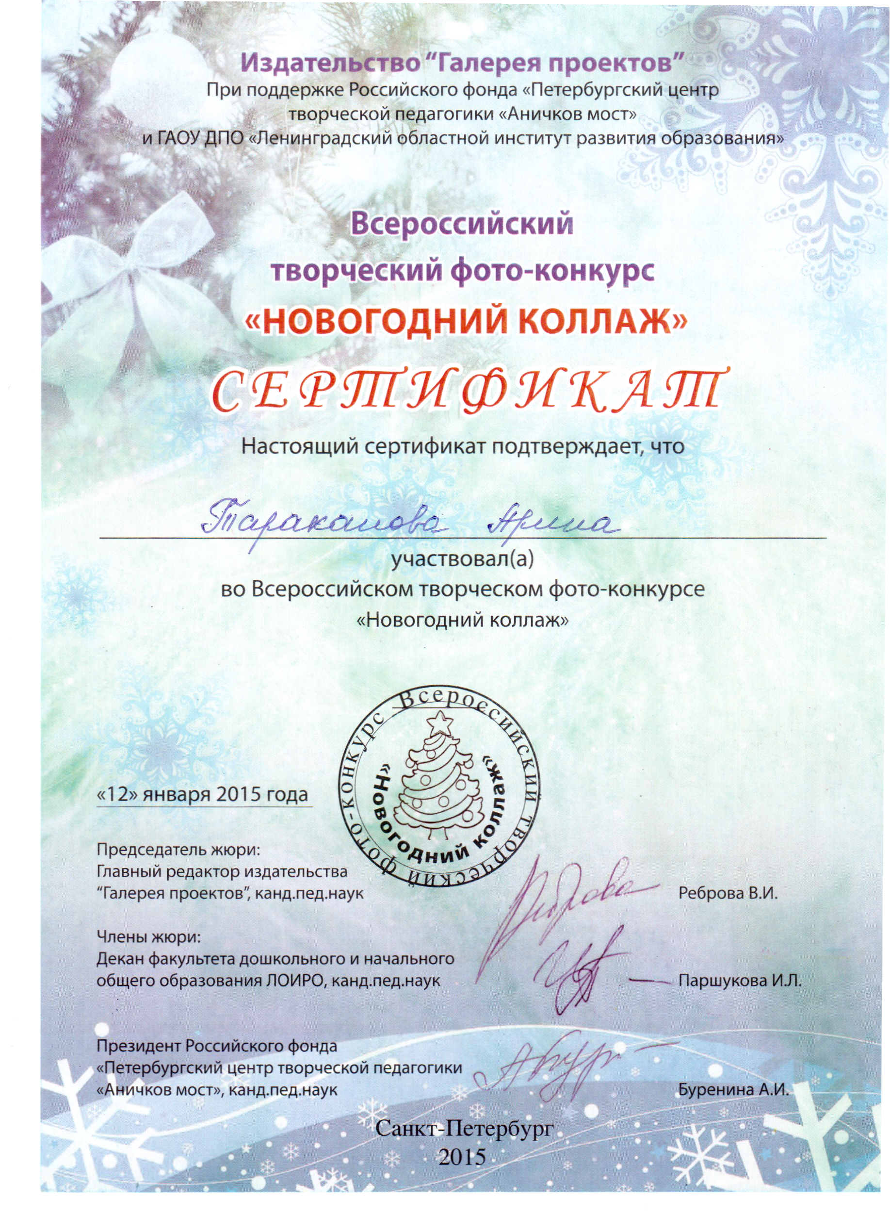 8. Сертификат за участие в конкурсе Тараканова Арина 4 года