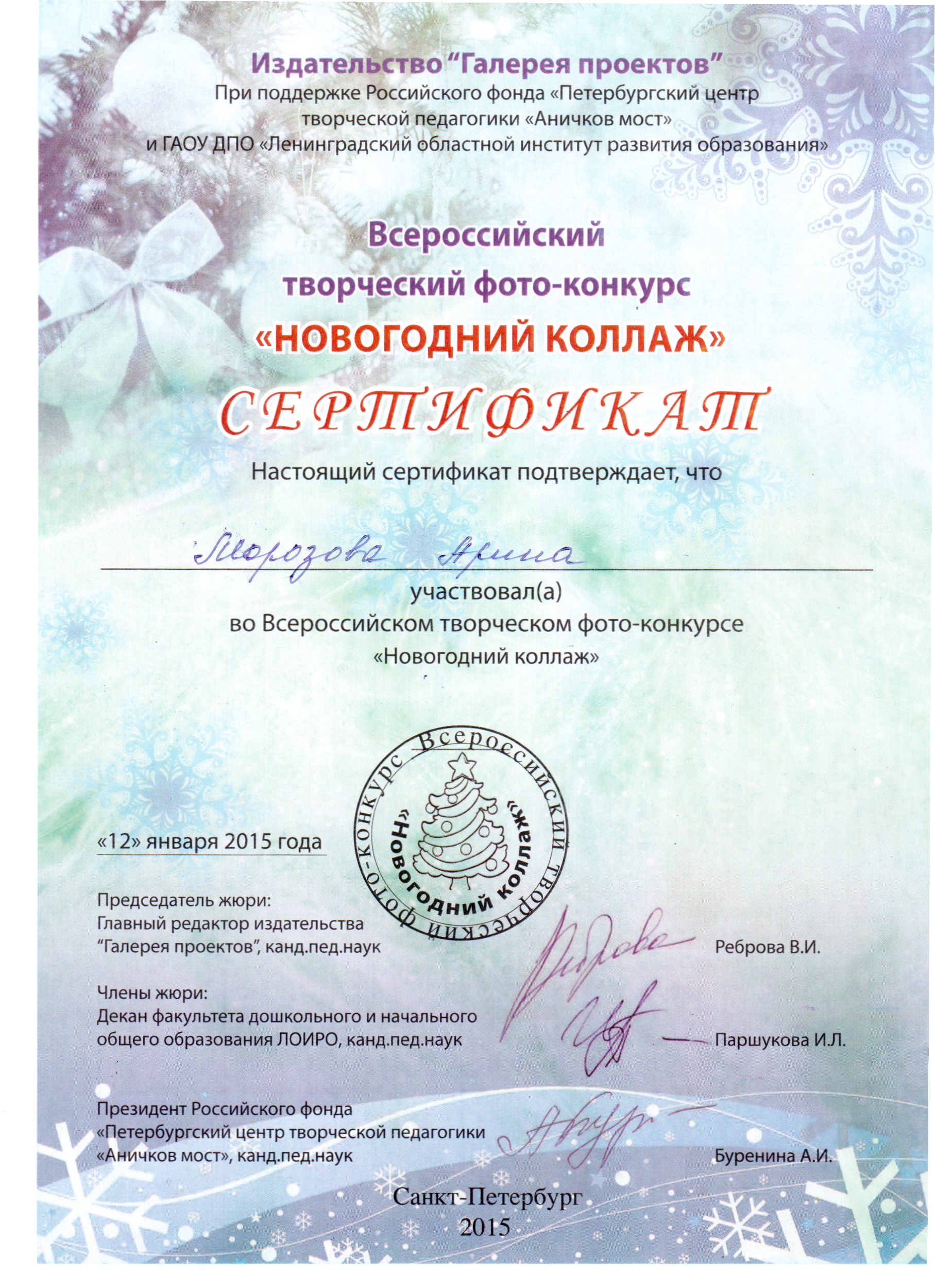 7. Сертификат за участие в конкурсе Морозова Арина 5 лет