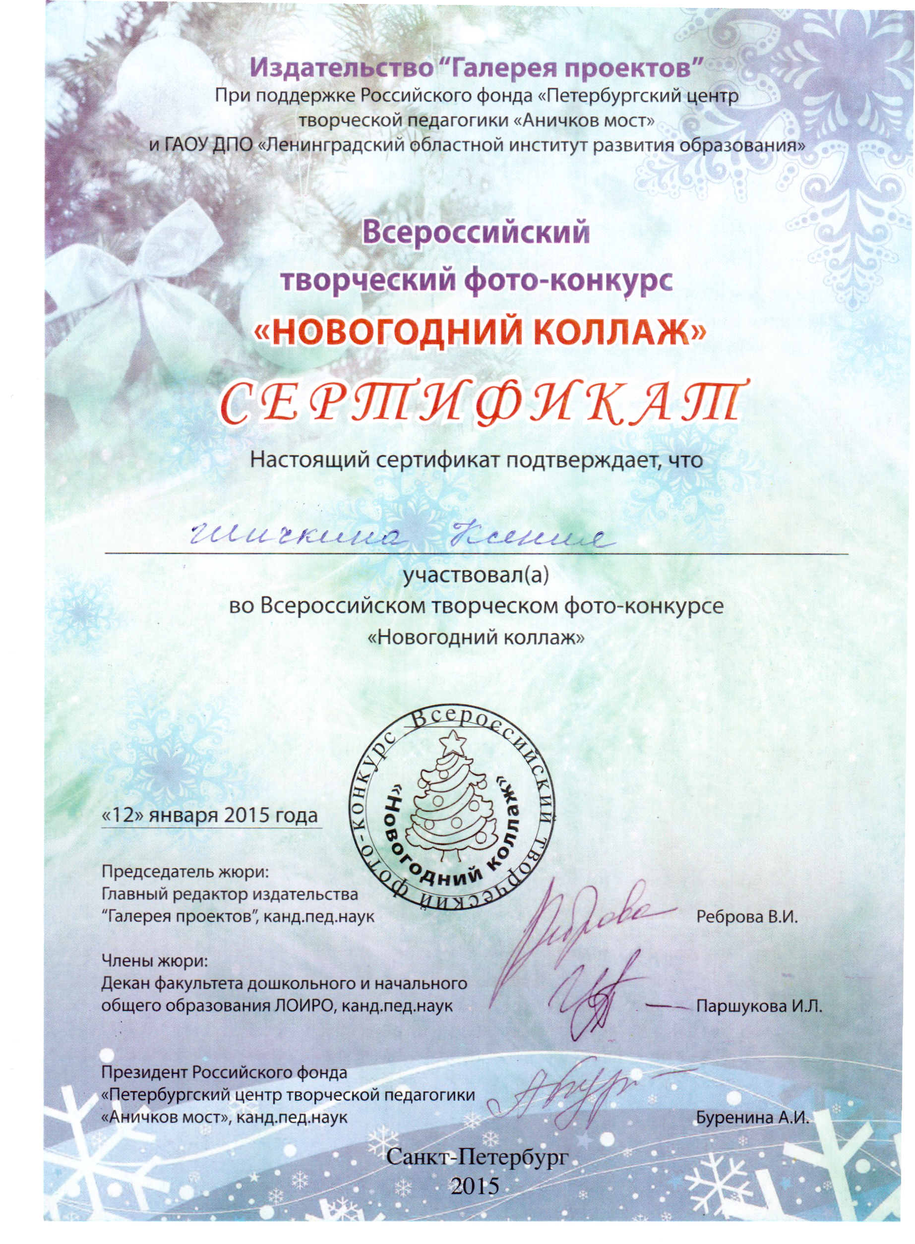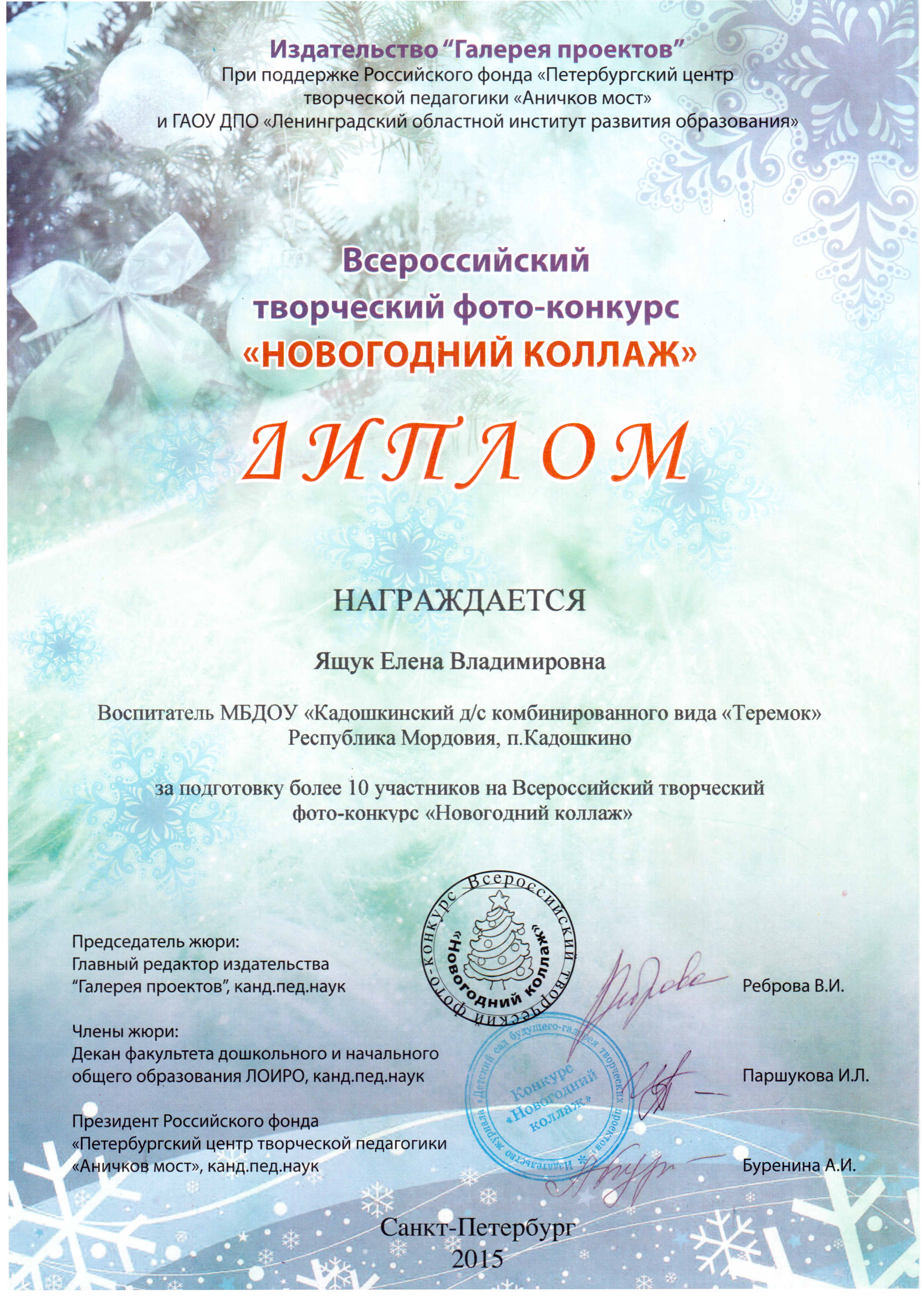В целях активизации деятельности педагогов в области художественно-эстетического и культурно-творческого воспитания подрастающего поколения, развития креативного мышления и расширения кругозора детей МБДОУ «Теремок» принял активное участие во всероссийском дистанционном фото-конкурсе детского творчества «Новогодний коллаж», организованный журналом «Детский сад будущего - галерея творческих проектов с региональной поддержкой Российского фонда «Петербургский центр творческой педагогики и ГАОУ ДПО «Ленинградскйй областной институт развития образования». В конкурсе приняли участие дети всех возрастных групп.
