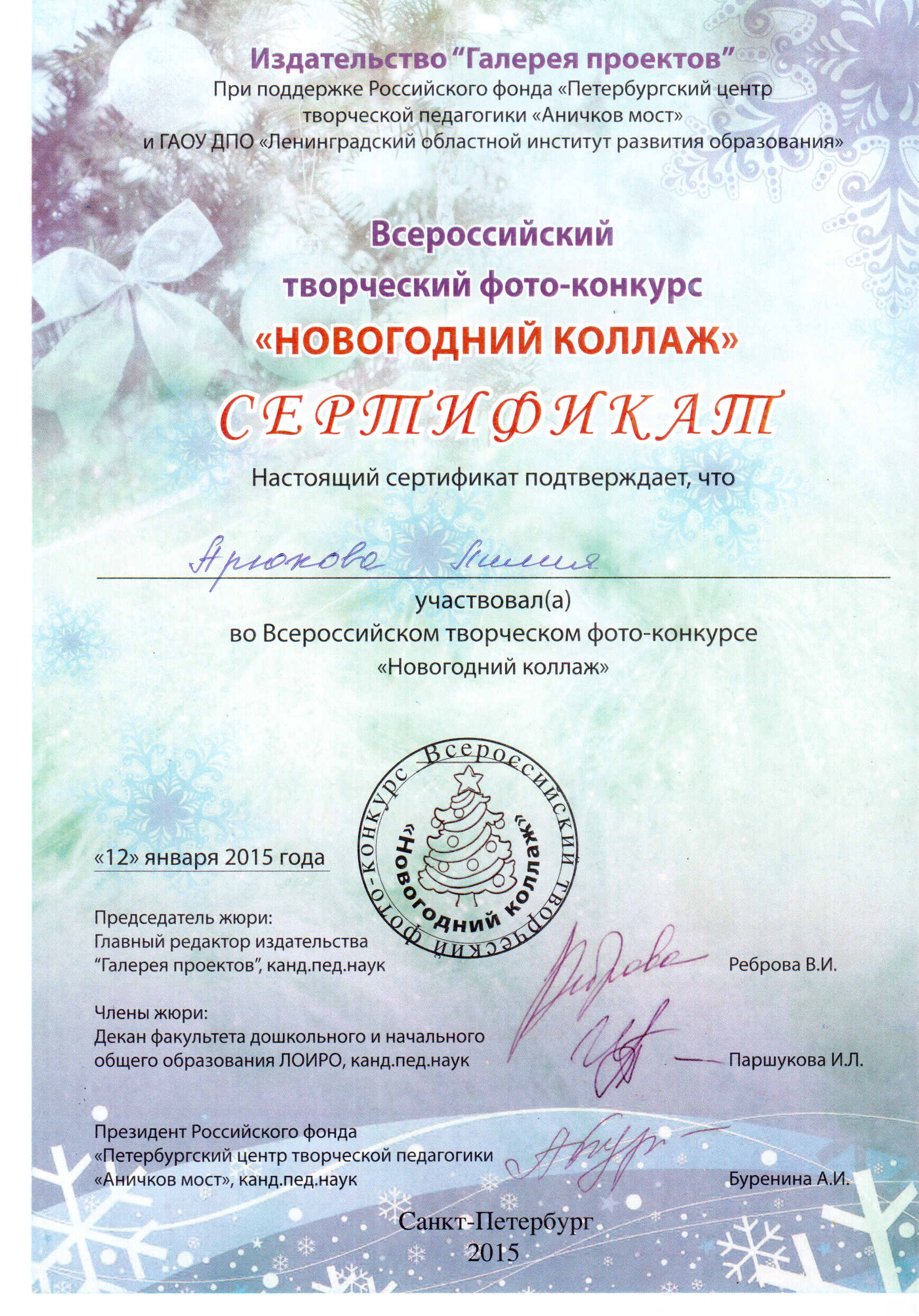 4. Сертификат за участие в конкурсе Арюкова Лилия 4 года