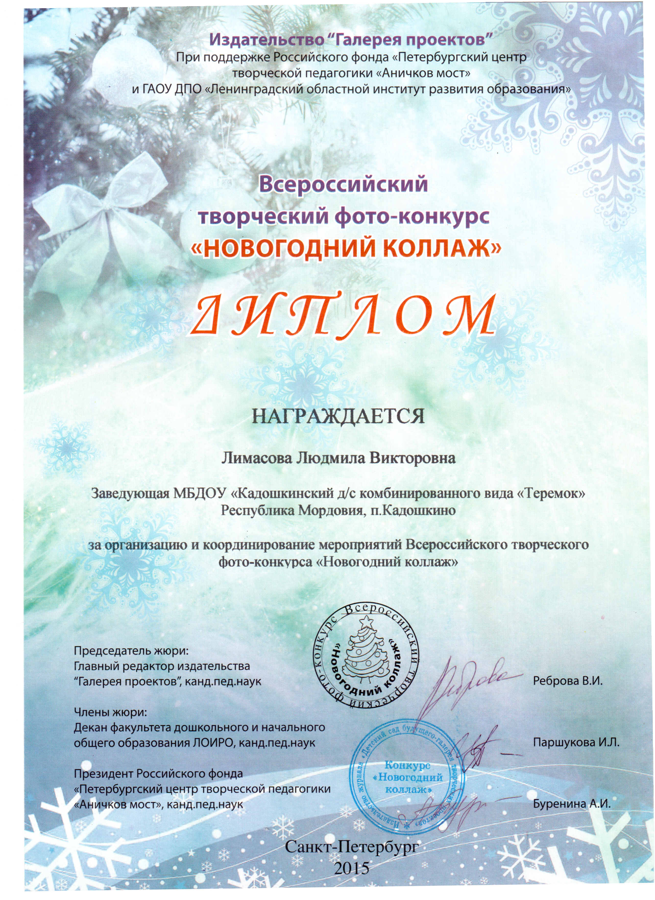 3. Диплом за организацию о координирование конкурса Лимасова Людмила Викторовна, заведующая