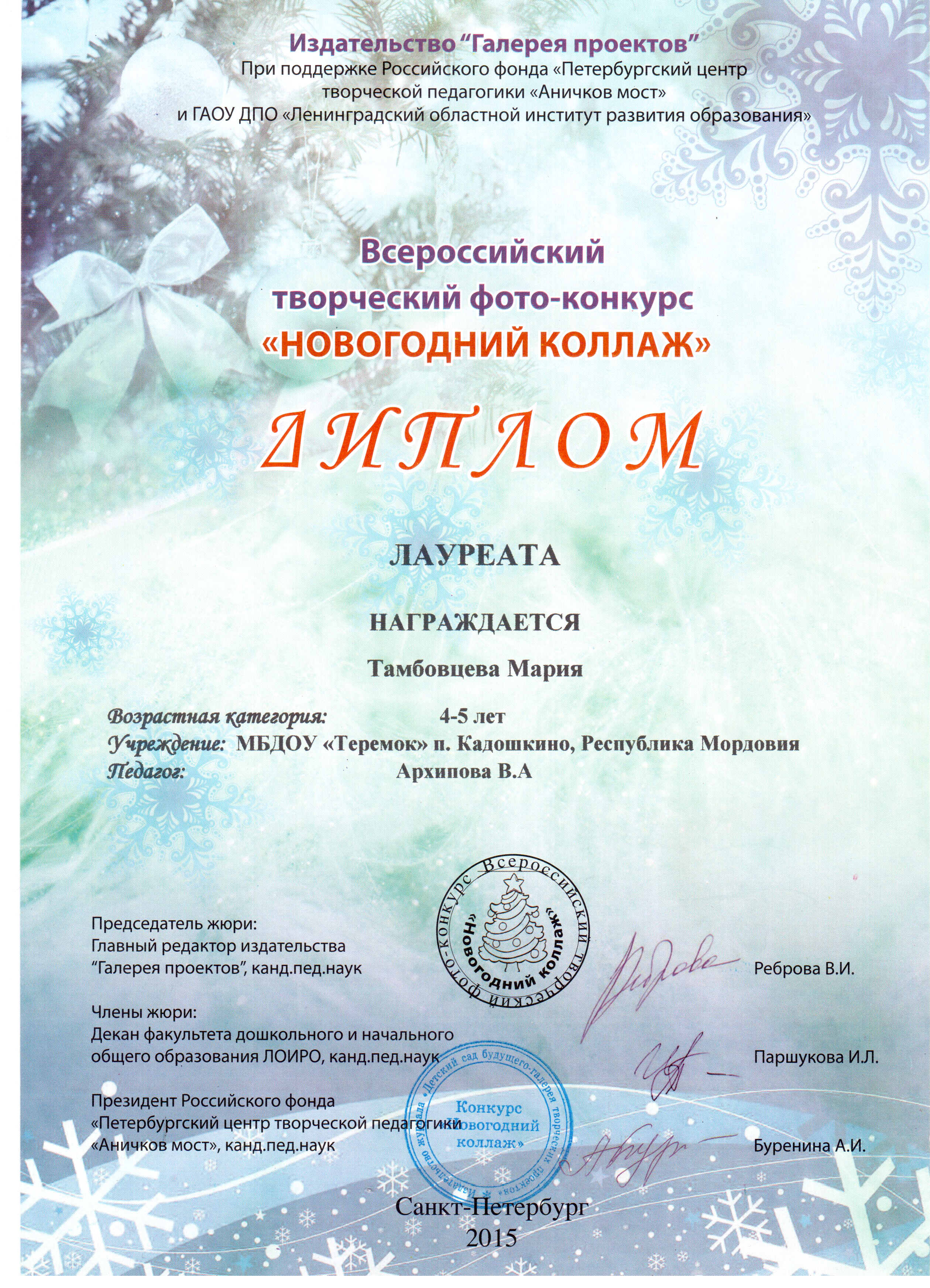 1. Диплом лауреата конкурса Тамбовцева Мария 5 лет