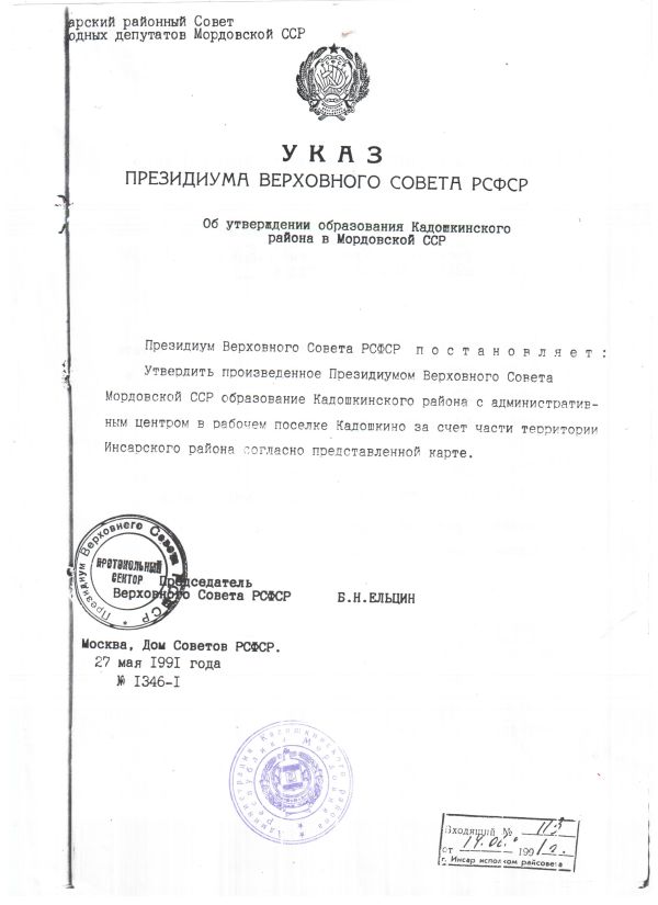 Кадошкинский район был возрожден в начале 90-х годов после настойчивых и долголетних ходатайств его жителей. Большую роль в этом сыграла инициативная группа патриотов района. В принятом 27 мая 1991 года Указе Президиума Верховного Совета РСФСР говорится: «Утвердить произведенное Президиумом Верховного Совета Мордовской ССР образование Кадошкинского района с административным центром в рабочем поселке Кадошкино за счет части Инсарского района...».