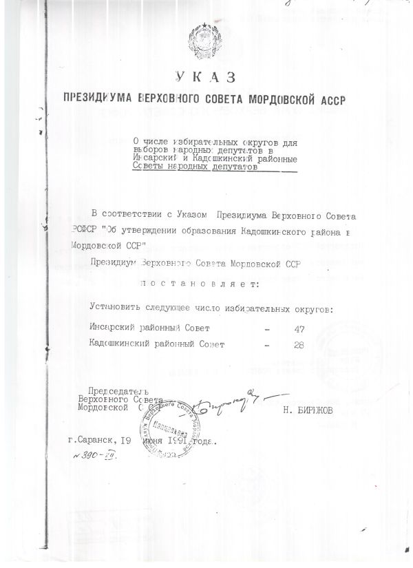 Затем слово было предоставлено Председателю Президиума Верховного Совета МССР Николаю Васильевичу Бирюкову, который подчеркнул, что Кадошкинский район создается в нелегкое время, и отметил, что искусственное объединение двух районов было ошибкой, приведшей к отставанию не только кадошкинской зоны, но и всего Инарского района. С «благословения» главы мордовского парламента началась работа по организации структур власти.