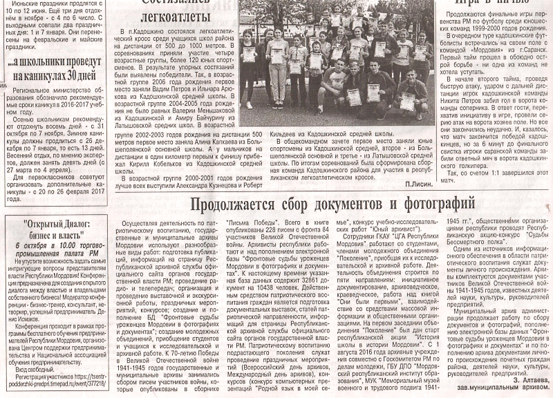 30.09.2016. Газета "Возрождение" "Продолжается сбор документов и фотографий"