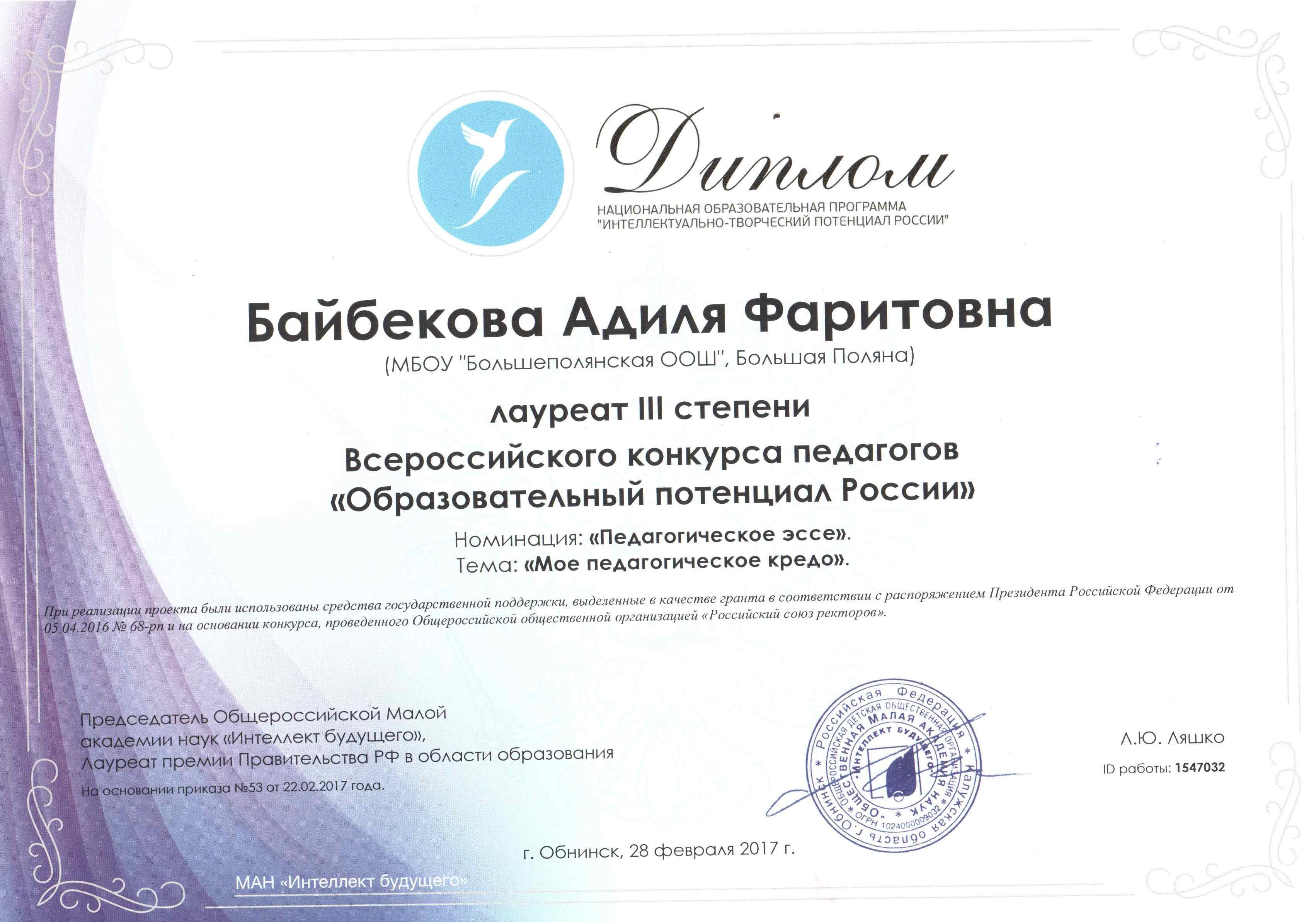 Лауреатом 3 степени Всероссийского конкурса педагогов «Образовательный потенциал России» стала учитель начальных классов МБОУ «Большеполянская ООШ» Кадошкинского района РМ Байбекова Адиля Фаритовна. Для участия в конкурсе она выбрала номинацию «Педагогическое эссе». Тема работы «Мое педагогическое кредо». В своей работе она подробно описала как и почему она стала учителем и какое удовлетворение получает от работы с учащимися начальной школы.