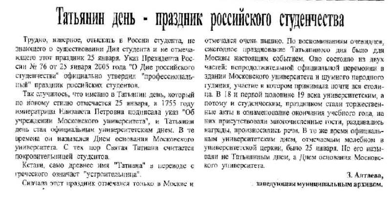 16.01.2018 Газета «Возрождение»: «Татьянин день- праздник российского студенчества»
