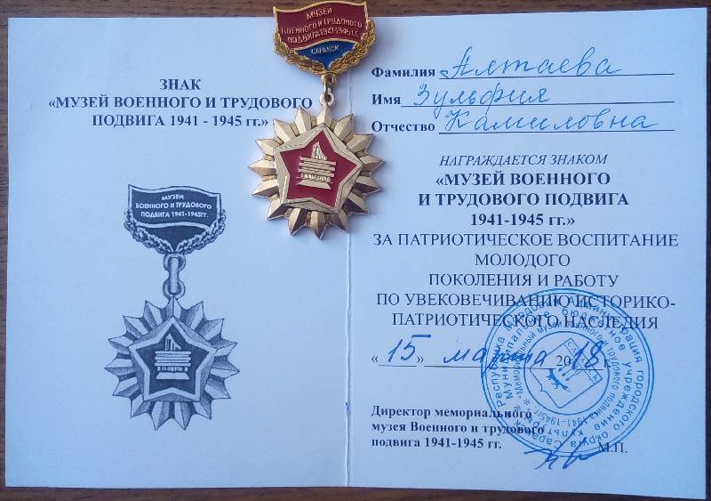Заведующая муниципальным архивом З.К.Алтаева за патриотическое воспитание молодого поколения и работу по увековечиванию историко-патриотического наследия награждена знаком «Музей военного и трудового подвига 1941-1945 гг.»