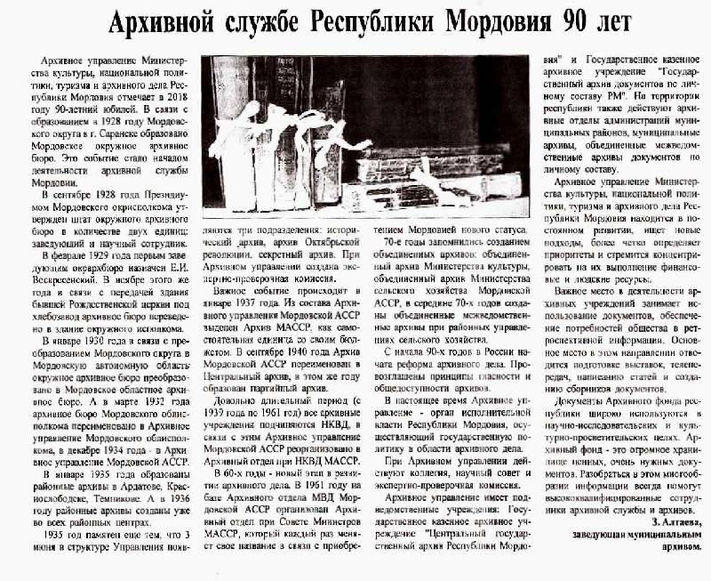 17.08.2018 Газета «Возрождение»: «Архивной службе Республики Мордовия 90 лет»